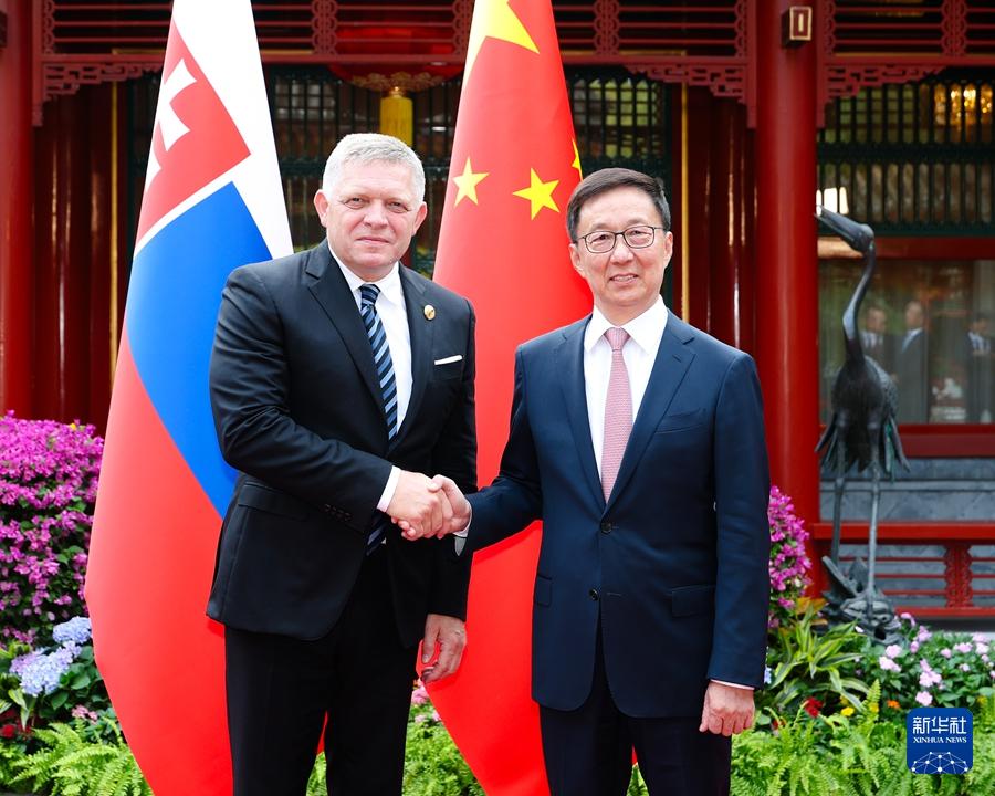 9月4日,國(guó)家副主席韓正在北京會(huì)見(jiàn)來(lái)華出席紀(jì)念中國(guó)人民抗日戰(zhàn)爭(zhēng)暨世界反法西斯戰(zhàn)爭(zhēng)勝利80周年活動(dòng)的斯洛伐克總理菲佐。新華社記者 劉彬 攝