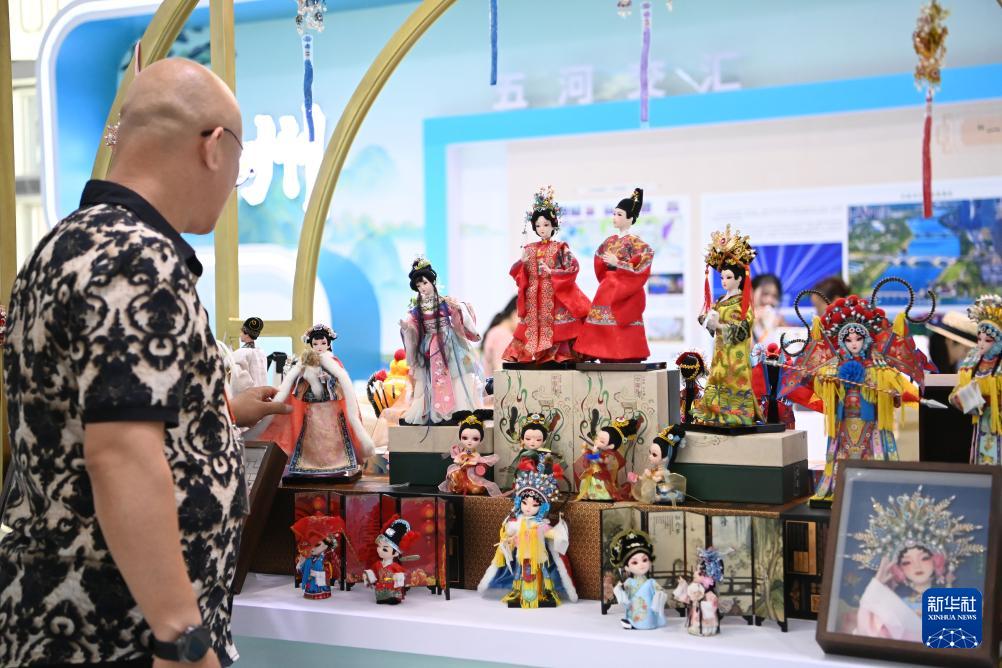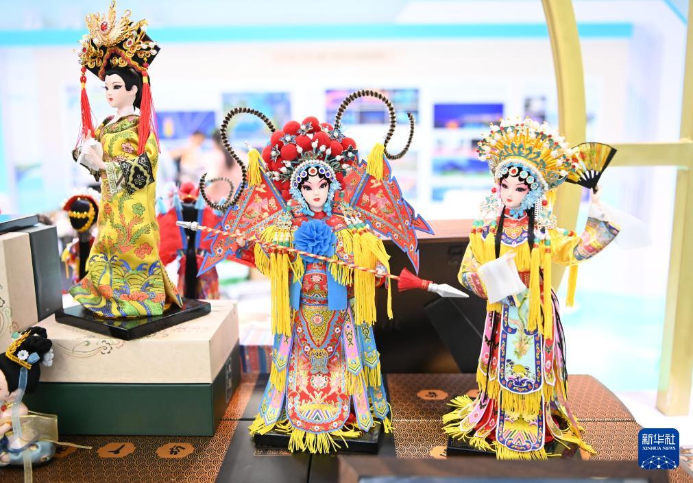 9月9日,參展商在服貿會展廳整理國家級非物質文化遺產北京絹人展品。