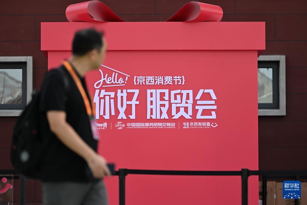 9月9日,在首鋼園,一名男子經過寫有“你好服貿會”的裝置。