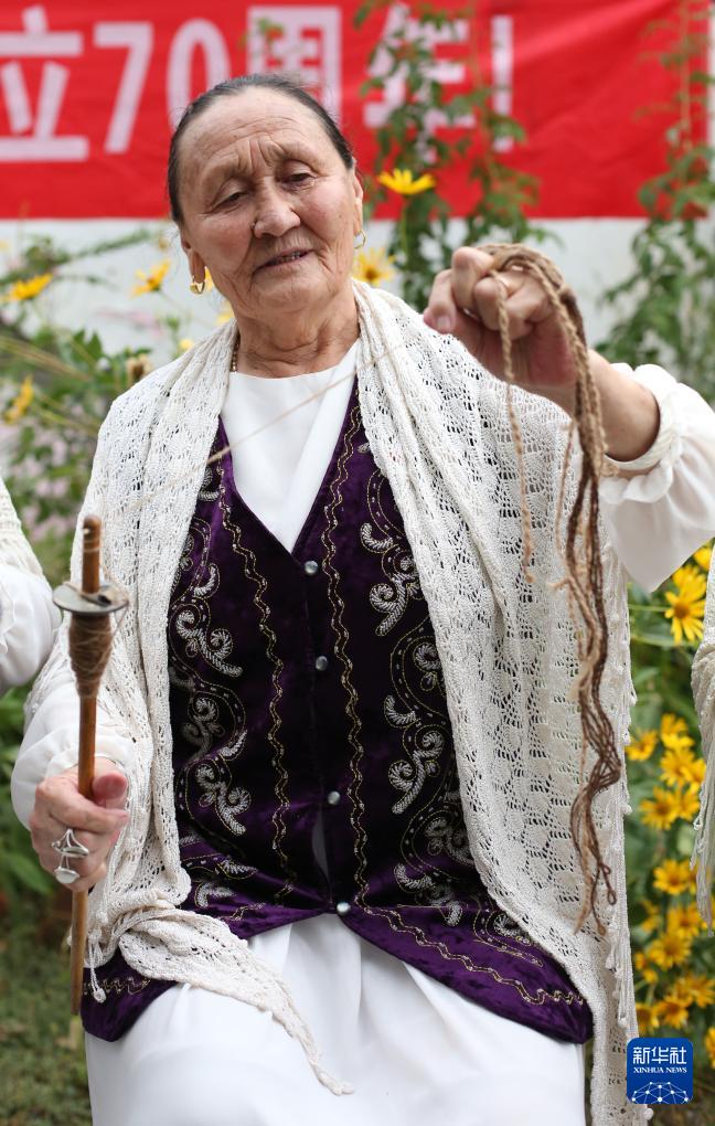 9月9日,75歲的哈薩克族老人馬合什·沃合什在“戶兒家”文化大院捻羊毛。
