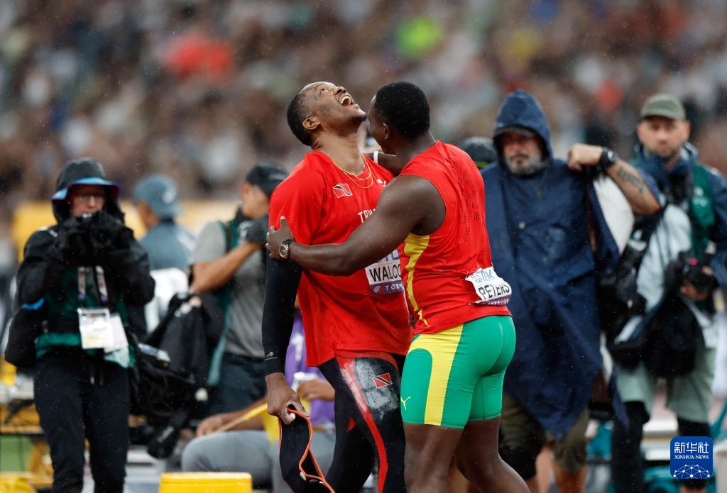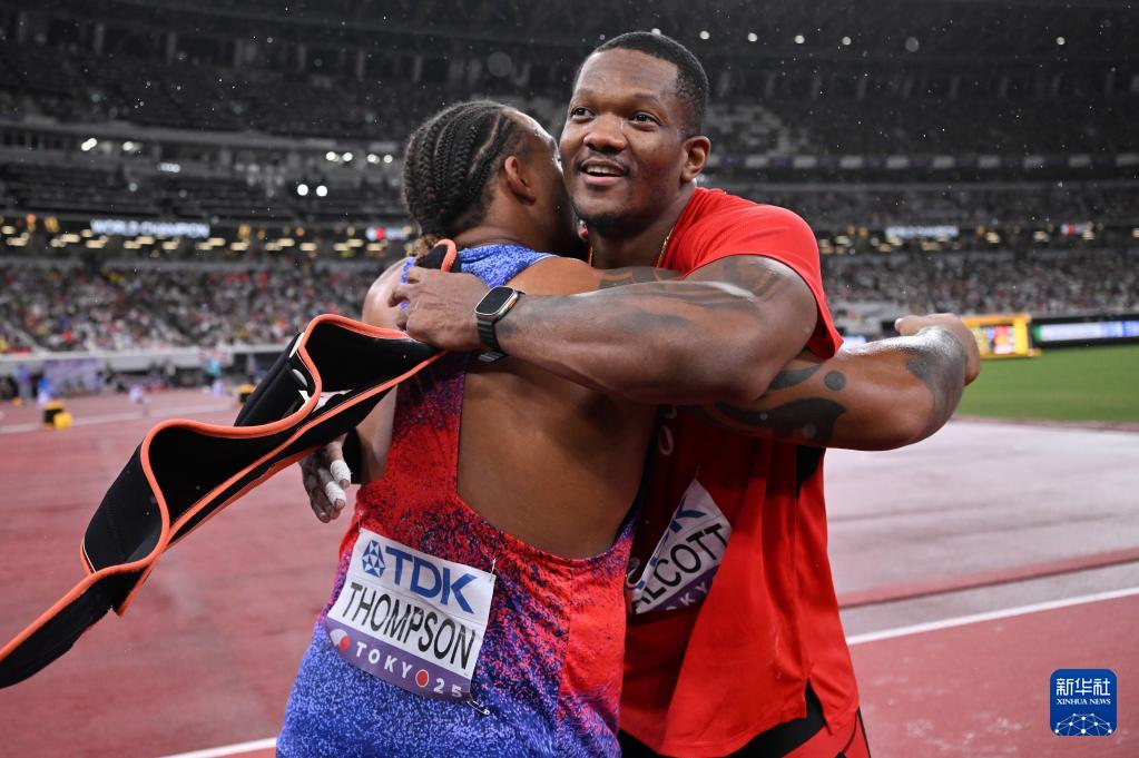 9月18日,冠軍特立尼達和多巴哥選手沃爾科特(右)和季軍美國選手湯普森在比賽后擁抱。