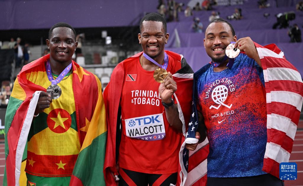 9月18日,冠軍特立尼達和多巴哥選手沃爾科特(中),亞軍格林納達選手彼得斯(左)和季軍美國選手湯普森在比賽后合影。