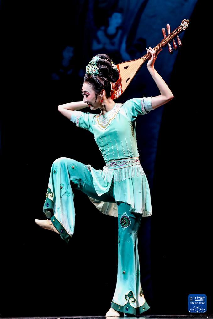 9月20日晚,演員在敦煌大劇院表演新版《絲路花雨》,展示經典舞姿“反彈琵琶”。