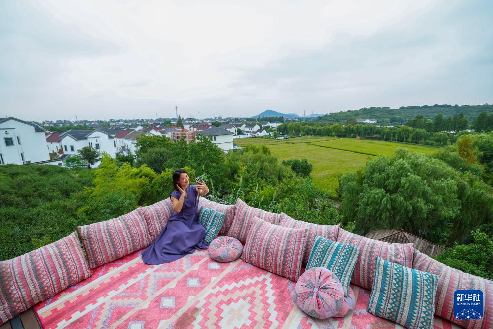 9月20日,游客在海鹽秦山街道永興村文溪塢“桃源文溪”山村景區自拍,這也是被沈蕩鎮一起帶火的海鹽特色文旅景點。