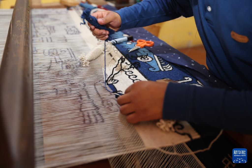 9月17日,在墨西哥瓦哈卡州特奧蒂特蘭-德?tīng)柊土惺幸患壹徔椆し唬止に嚾擞锰ぐ蹇棛C(jī)紡織羊毛毯。