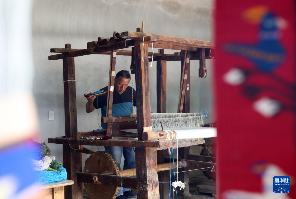 9月17日,在墨西哥瓦哈卡州特奧蒂特蘭-德爾巴列市一家紡織工坊,手工藝人用踏板織機紡織羊毛毯。