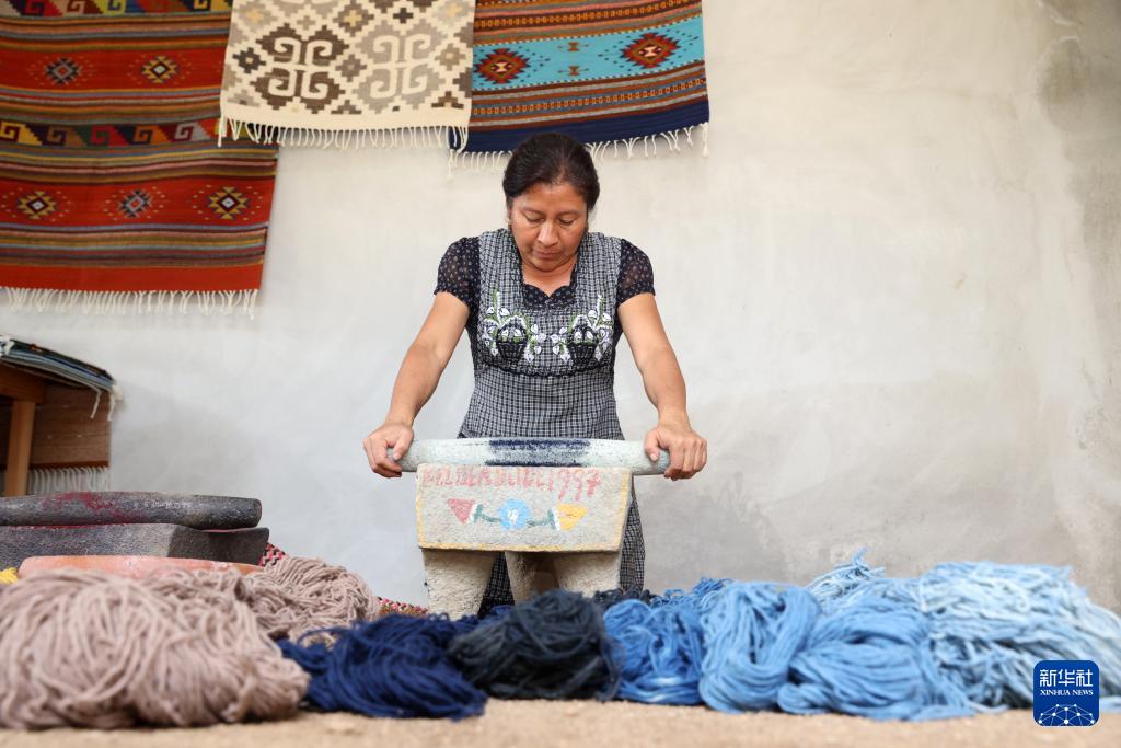 9月17日,在墨西哥瓦哈卡州特奧蒂特蘭-德爾巴列市一家紡織工坊,手工藝人研磨植物提取染料。