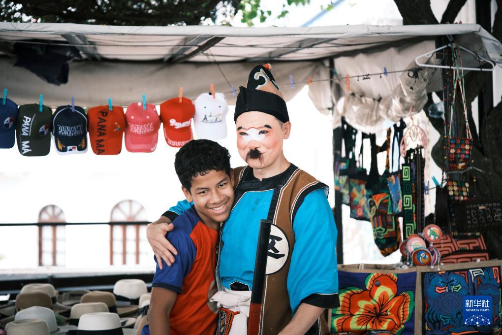 9月22日,中國(guó)泉州文旅推介小分隊(duì)的高甲戲演員在巴拿馬首都巴拿馬城與當(dāng)?shù)鼐用窈嫌啊?/p>
