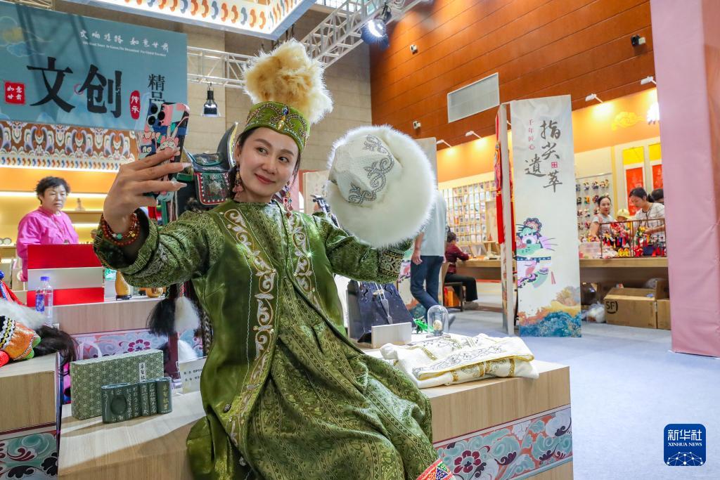 9月22日,游客在敦煌文博會上的一個展覽現場身穿民族服飾自拍。