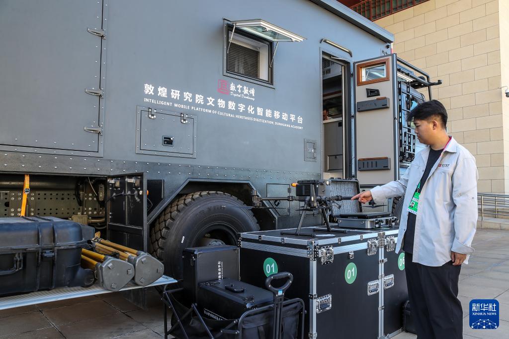 9月22日,在敦煌研究院“典范”“高地”建設成果展上,工作人員介紹敦煌研究院文物數字化智能移動平臺及其配套設備。