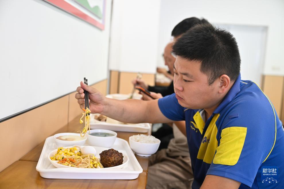 9月22日,一名快遞員在小米行大食堂用餐。