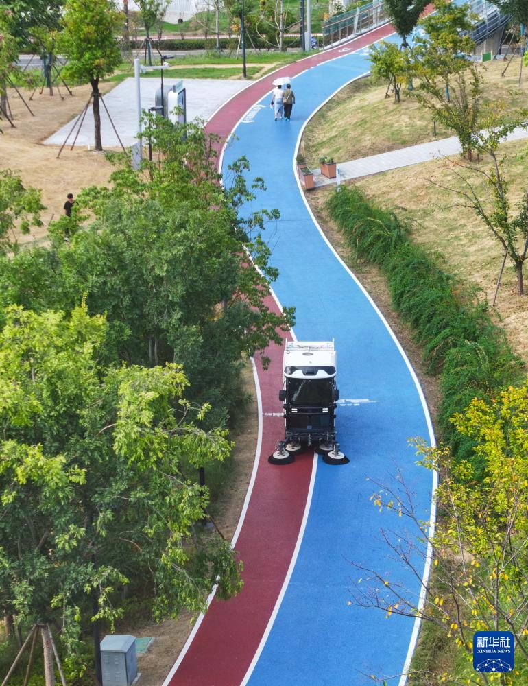 無人駕駛清掃車在南京市雨花臺區的數據線公園路面上作業(9月22日攝,無人機照片)。