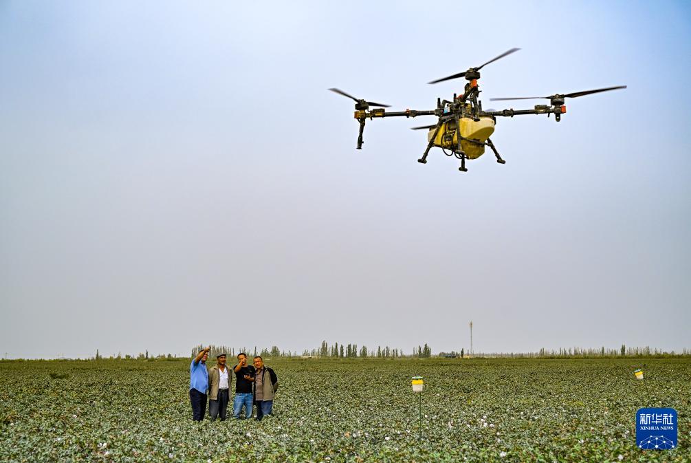 9月19日,極飛超級棉田負責人艾海鵬(右二)在尉犁縣的示范棉田里為達西村村民進行智能無人機灑藥培訓。無人化智慧農場應用農業無人機、農業無人車、遙感無人機、農機自駕儀等系列物聯設備實施“水肥一體化”管理,農民用一部手機即可操作智能設備完成多項田間管理工作。
