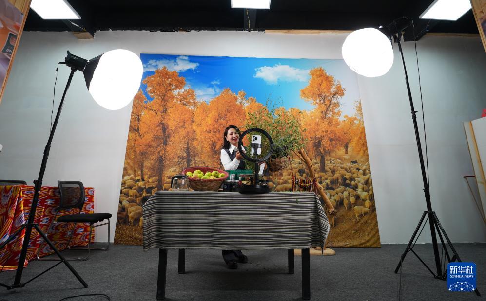 9月19日,尉犁縣電商協會負責人米日阿依·阿西木在達西村的電商基地直播推介達西村農產品。近年來,達西村構建“農戶生產+企業加工包裝+電商銷售+物流配送”全產業鏈,為縣域經濟發展培養孵化本土直播電商人才,促進傳統產業轉型升級。