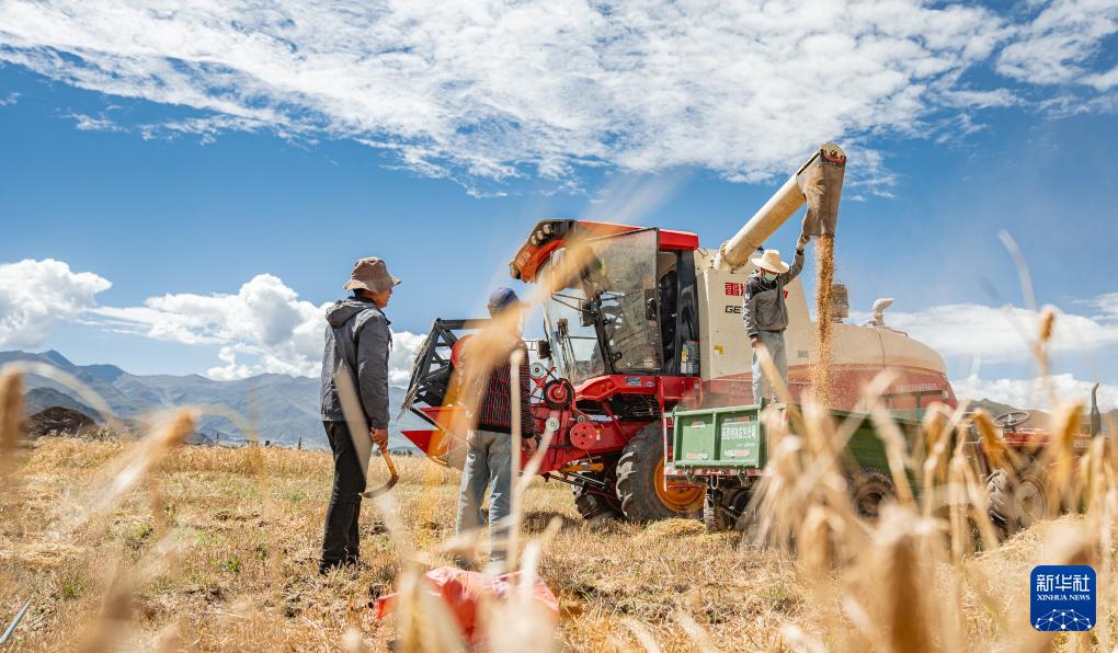 9月23日,在西藏拉薩市林周縣松盤鄉崗巴村,農民用收割機收獲青稞。