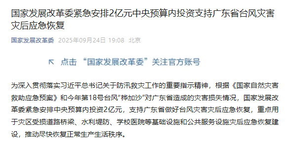 國家發展改革委緊急安排2億元中央預算內投資支持廣東省臺風災害災后應急恢復