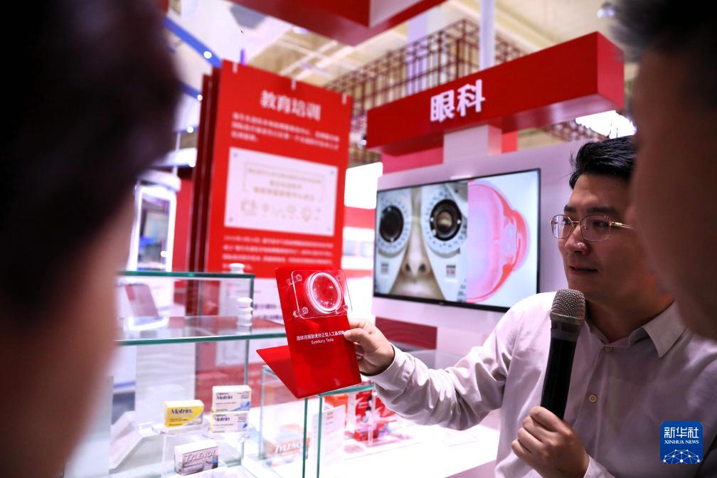 9月24日,工作人員為參觀者介紹"連續視程散光矯正型人工晶狀體"。