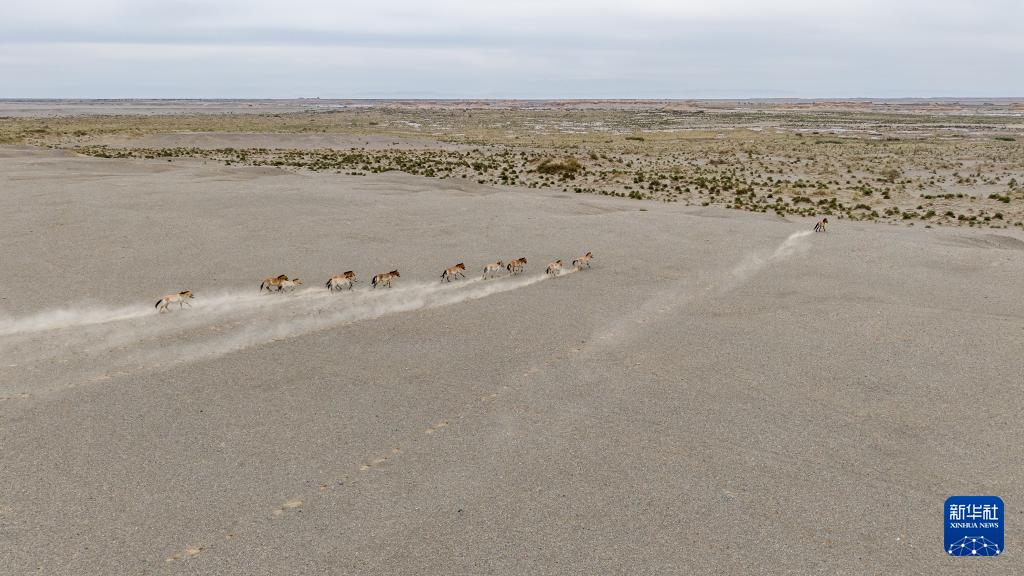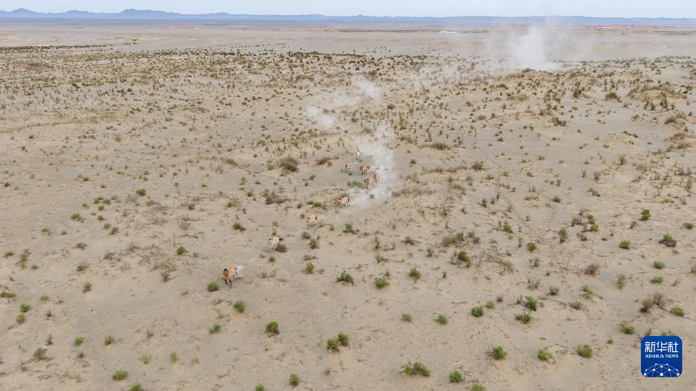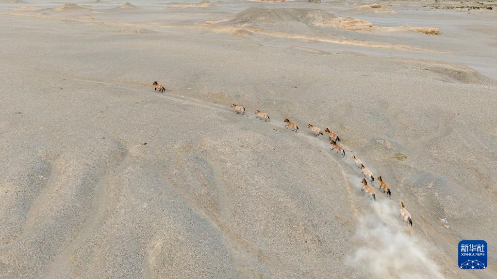 這是9月24日在甘肅敦煌西湖國家級自然保護區內拍攝的普氏野馬(無人機照片)。