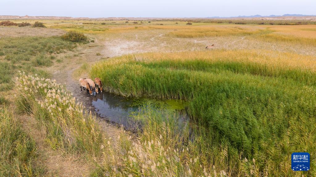 9月24日,普氏野馬在甘肅敦煌西湖國家級自然保護(hù)區(qū)內(nèi)飲水(無人機(jī)照片)。