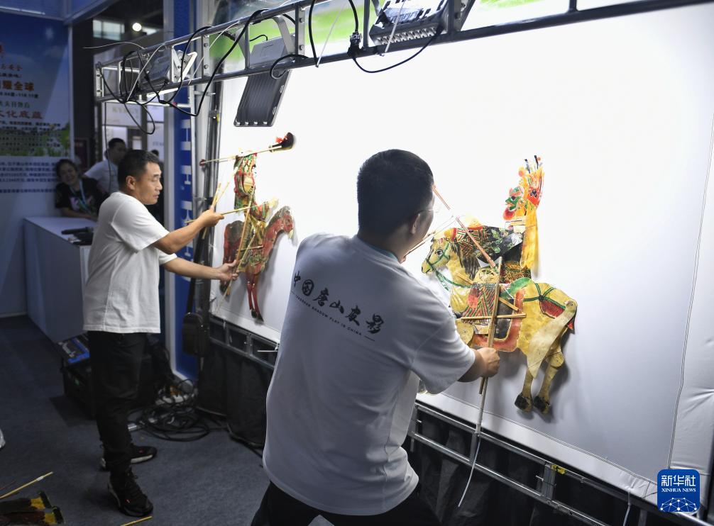 9月26日,來自河北唐山的皮影戲藝人在博覽會上表演皮影戲。