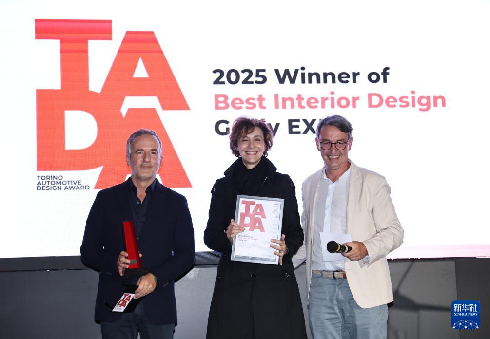 9月26日,在意大利都靈,榮獲"都靈汽車設(shè)計(jì)獎(jiǎng)"最佳內(nèi)飾設(shè)計(jì)獎(jiǎng)的吉利"銀河E5"代表領(lǐng)獎(jiǎng)。新華社記者 李京 攝