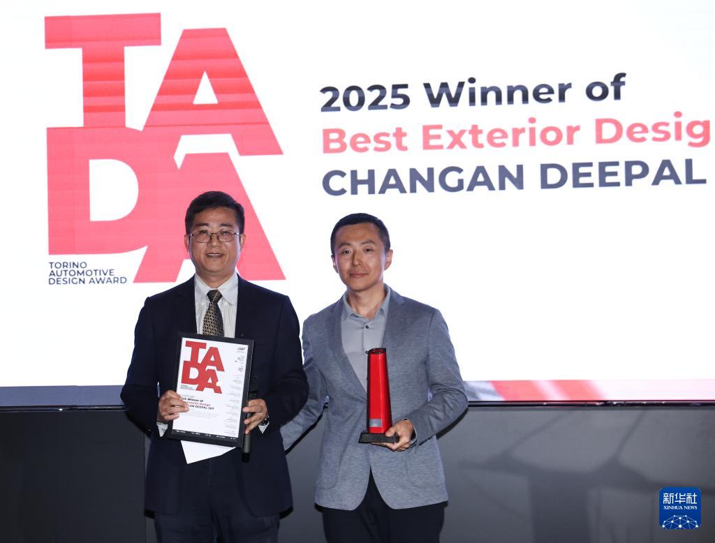 9月26日,在意大利都靈,榮獲"都靈汽車設(shè)計(jì)獎(jiǎng)"最佳外觀設(shè)計(jì)獎(jiǎng)的長(zhǎng)安"深藍(lán)S07"代表領(lǐng)獎(jiǎng)。新華社記者 李京 攝