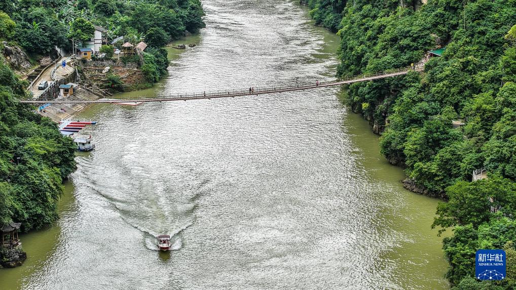 景區內的索道橋與遠處的花江峽谷大橋遙相呼應(9月27日攝,無人機照片)。