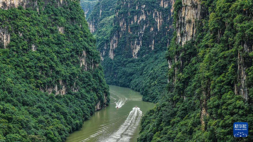 游客乘船游覽花江大峽谷景區(9月27日攝,無人機照片)。