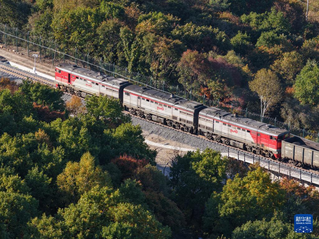 9月27日,滿載大宗品類貨物的入境列車在濱綏鐵路綏芬河至國境線提質改造工程新線路上行駛(無人機照片)。