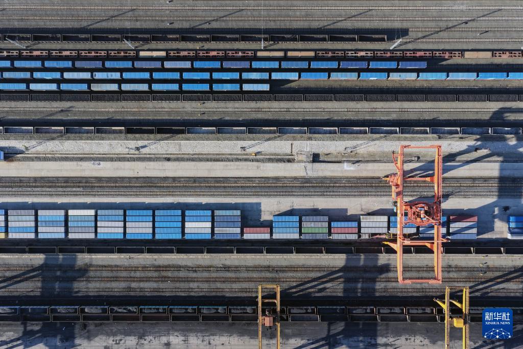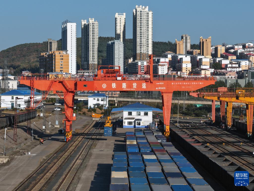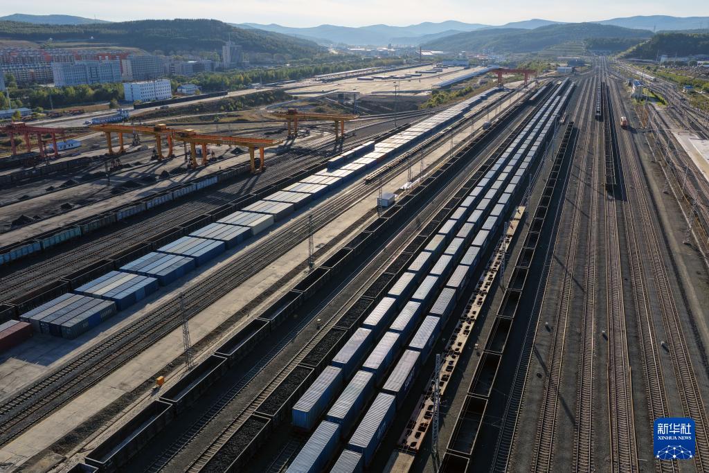 9月27日,滿載貨物的列車在綏芬河站北場進行換裝作業(無人機照片)。
