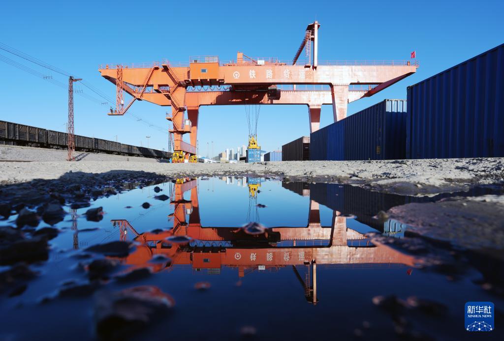 9月27日,在綏芬河站集裝箱換裝場,龍門吊在對回程中歐班列進行換裝作業。