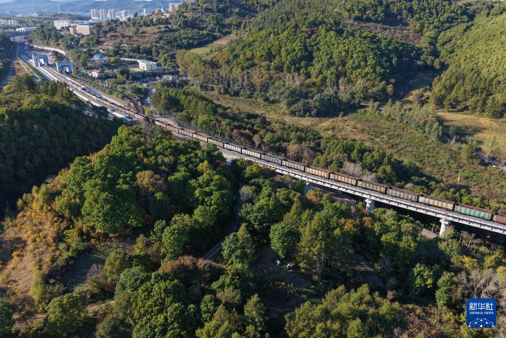 9月27日,滿載大宗品類貨物的入境列車在濱綏鐵路綏芬河至國境線提質改造工程新線路上行駛(無人機照片)。