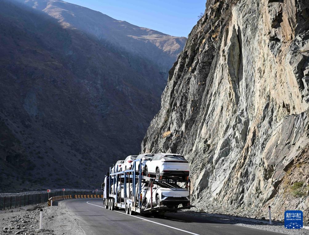 9月11日,一輛載有中國品牌汽車的籠車行駛在塔吉克斯坦卡拉依洪姆村附近的中塔公路二期路段上。 新華社記者 李任滋 攝