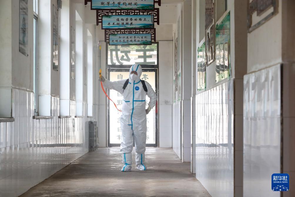 9月28日,在定西市漳縣木林小學安置點,工作人員在進行環境消殺作業。
