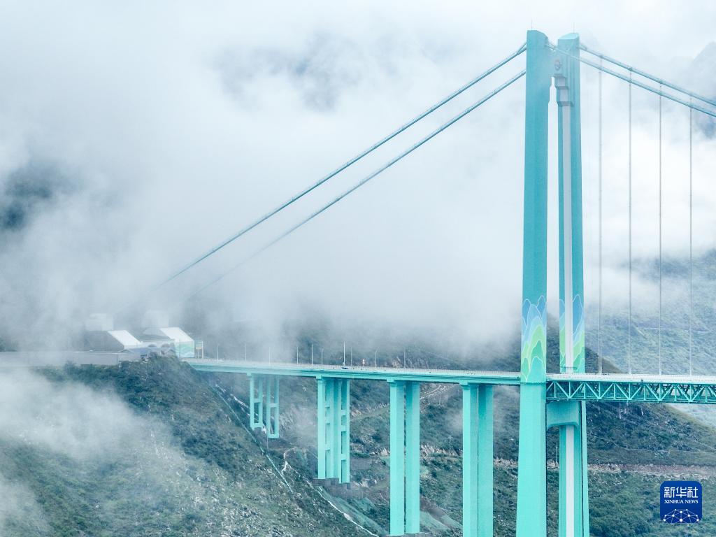 9月26日拍攝的云霧中的貴州花江峽谷大橋(無人機照片)。