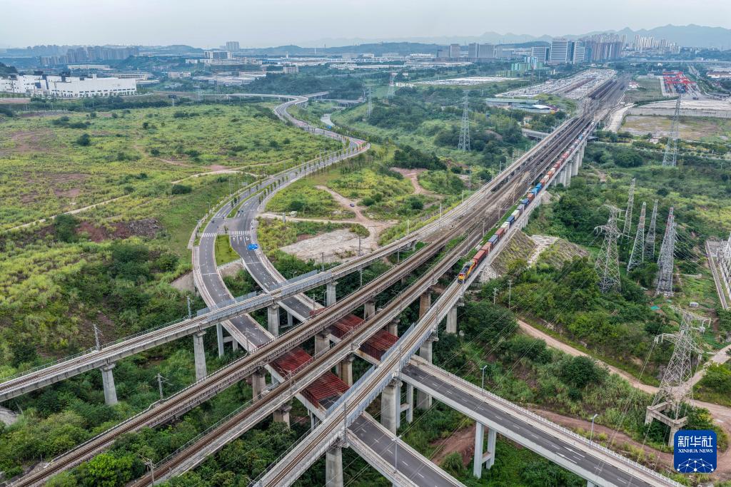 9月28日,西部陸海新通道班列在重慶魚嘴站順利發(fā)車(無人機(jī)照片)。