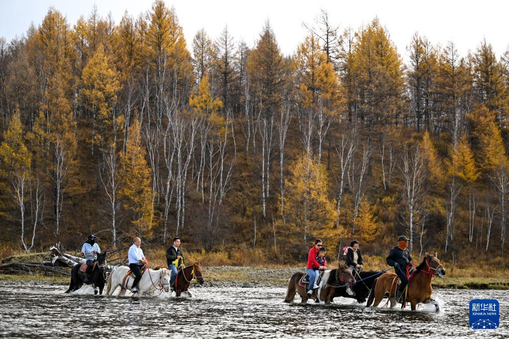 9月29日,游客在內蒙古阿爾山國家森林公園不凍河上騎馬。