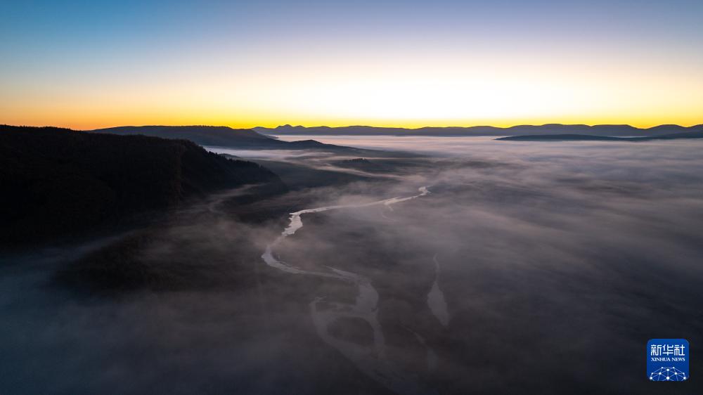 9月29日拍攝的日出前的內(nèi)蒙古阿爾山國(guó)家森林公園景色(無人機(jī)照片)。