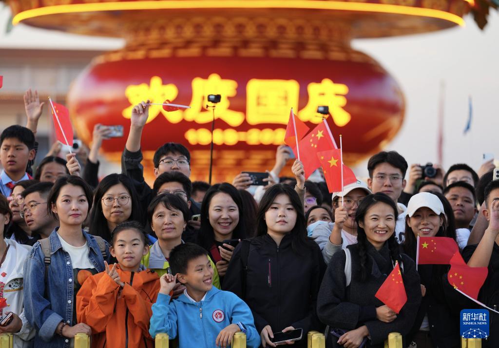 10月1日清晨,隆重的升國(guó)旗儀式在北京天安門廣場(chǎng)舉行,慶祝中華人民共和國(guó)成立76周年。這是觀眾在升旗儀式后歡呼。
