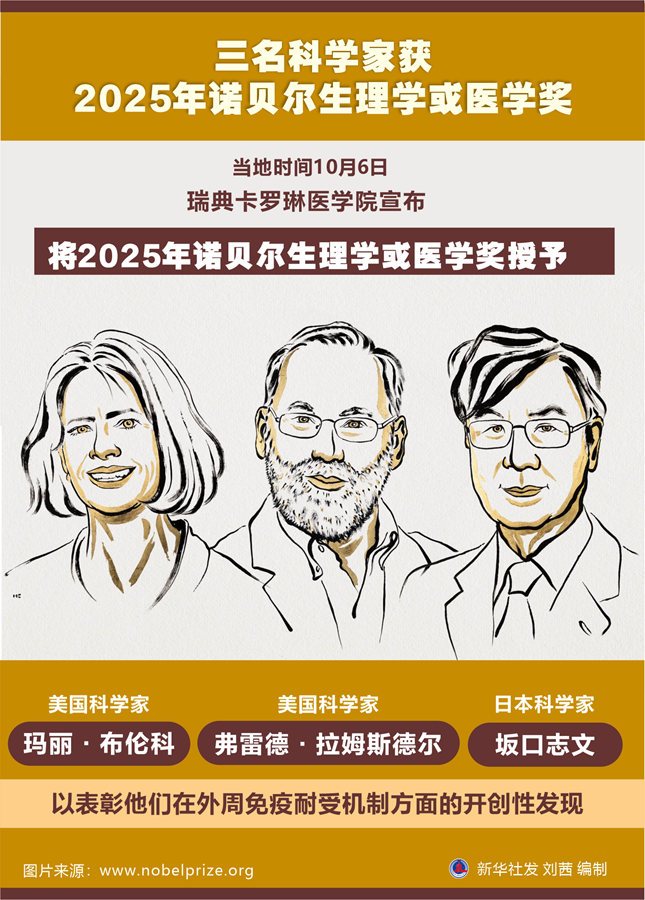 新華社斯德哥爾摩10月6日電(記者郭爽 張兆卿)瑞典卡羅琳醫學院6日宣布,將2025年諾貝爾生理學或醫學獎授予美國科學家瑪麗·布倫科、弗雷德·拉姆斯德爾和日本科學家坂口志文,以表彰他們在外周免疫耐受機制方面的開創性發現。
