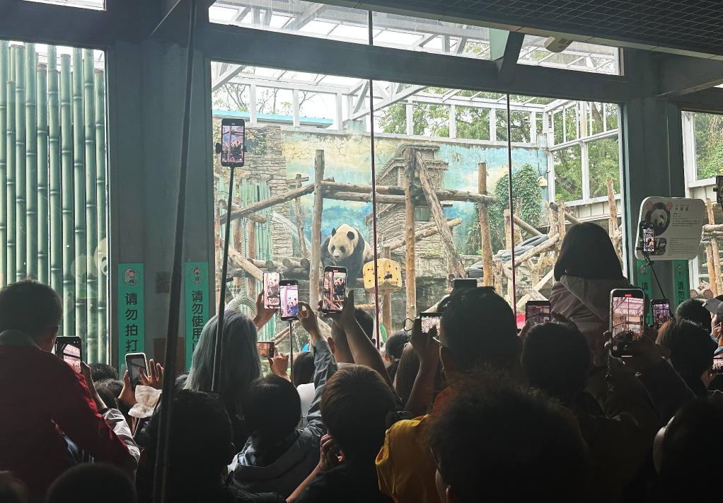 展廳玻璃前,里三層外三層圍滿了游客,大家高舉手機、相機,不想錯過大熊貓的每個精彩動作。只見活潑的“吉年”一會兒爬上木架,一會兒去玩水,一會兒又坐下來盡情啃著竹筍。“福將”則與寫著“花好月圓”的豐容玩具打得火熱,憨態可掬的模樣惹人憐愛。