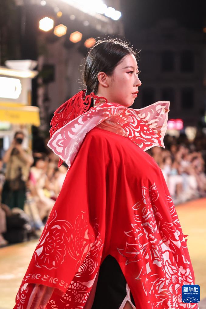 10月7日晚,作為2025海口藝術周系列活動之一,錦色·2025非遺潮秀在海口騎樓老街啟幕。活動以"非遺再創"為核心,將剪紙藝術元素融入時裝走秀。