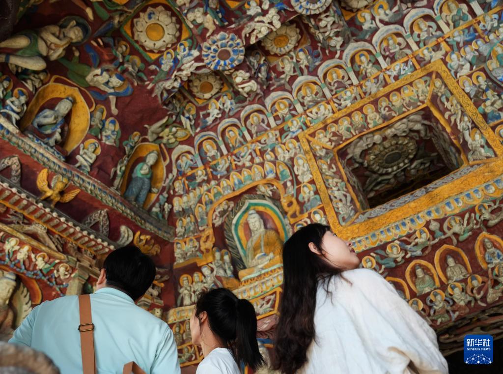 10月9日,在位于今潮8弄的戶外展區(qū),參觀者游覽云岡第12窟"音樂窟"的1:1復(fù)制洞窟。