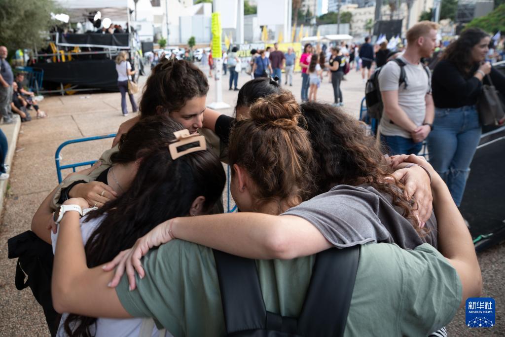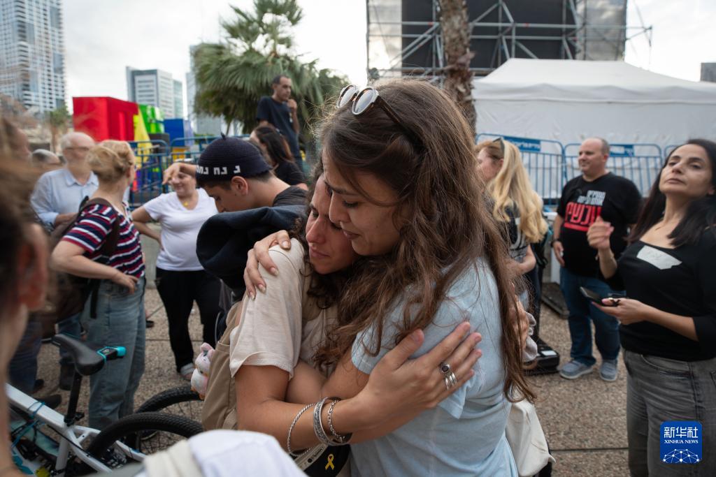 10月9日,在以色列特拉維夫,人們獲悉加沙停火協議的消息后相互慶祝,期待被扣押的人員早日獲釋。