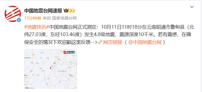 中國地震臺網正式測定:10月11日11時18分在云南昭通市魯甸縣(北緯27.03度,東經103.46度)發生4.8級地震,震源深度10千米。