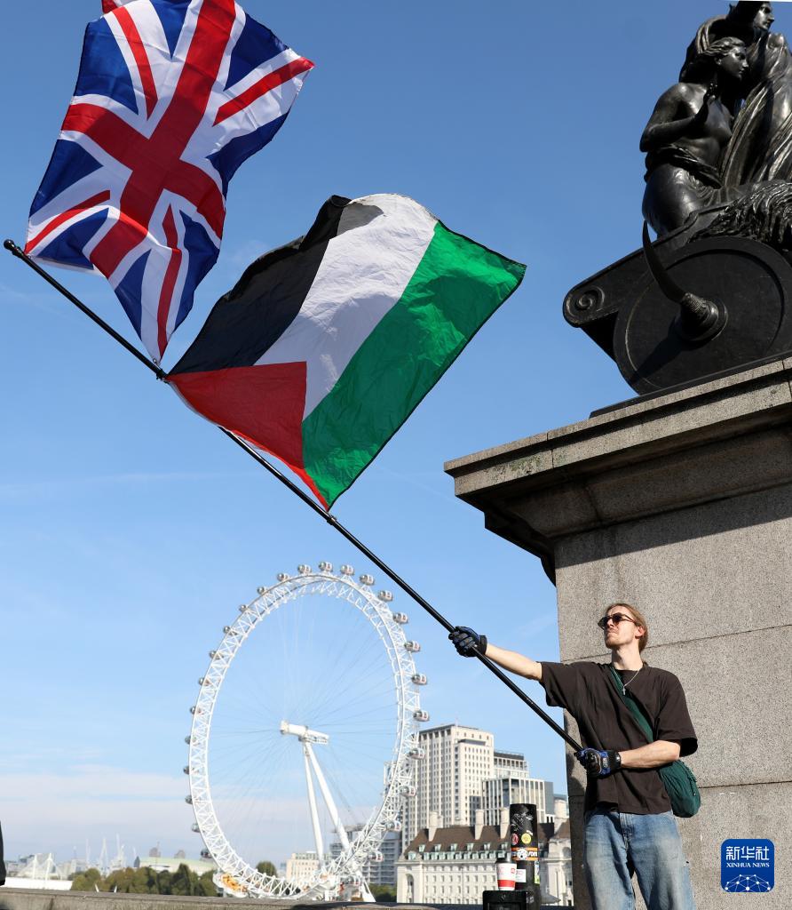 當日,英國民眾在倫敦舉行游行活動聲援巴勒斯坦,呼吁加沙實現持久和平。