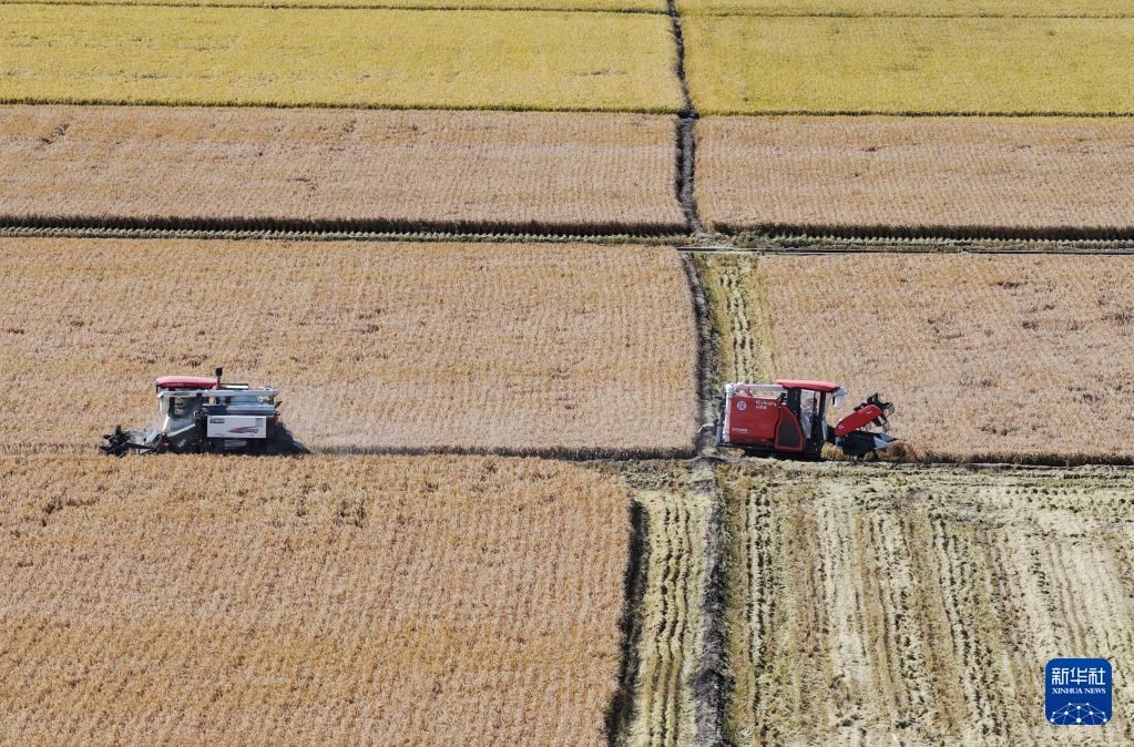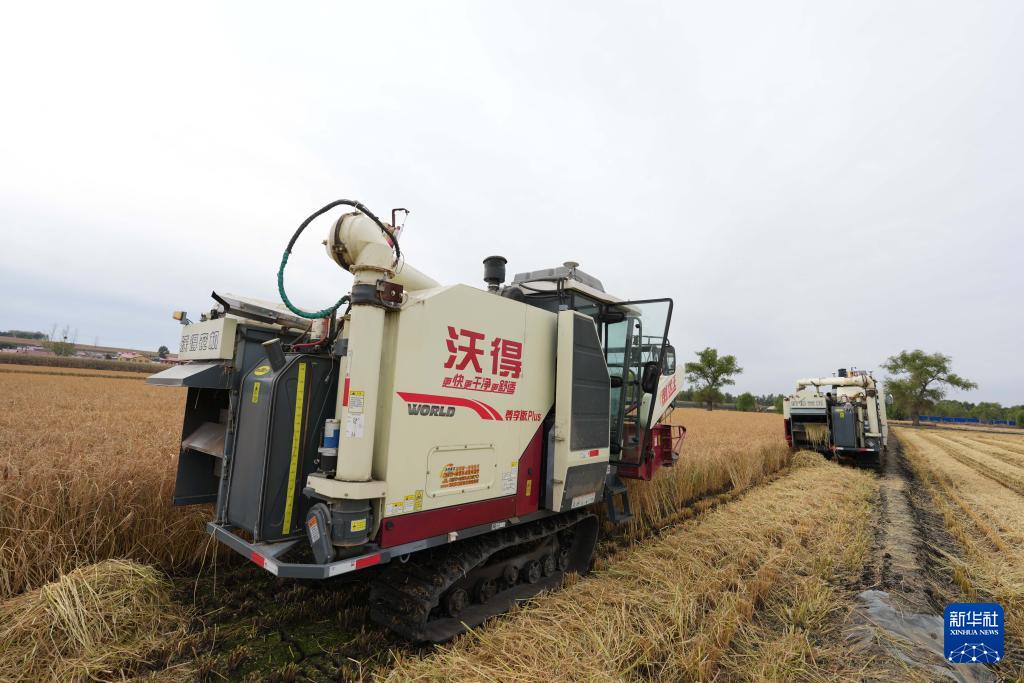 在位于黑龍江省雙鴨山市的北大荒集團友誼農場有限公司,機械設備在進行水稻收獲作業(9月23日攝)。