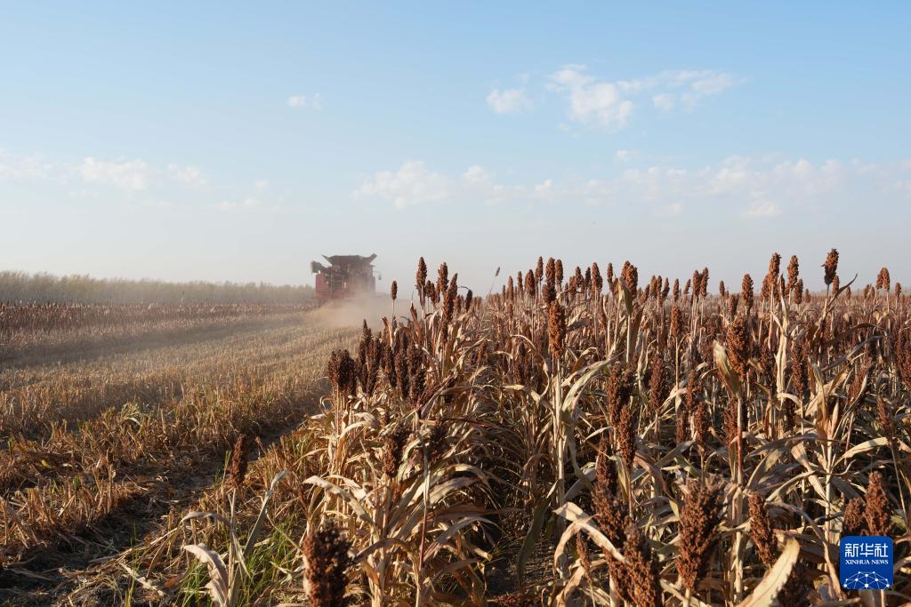 10月11日,在位于黑龍江省肇東市的北大荒集團四方山農場有限公司,機械設備在進行高粱收獲作業(無人機照片)。