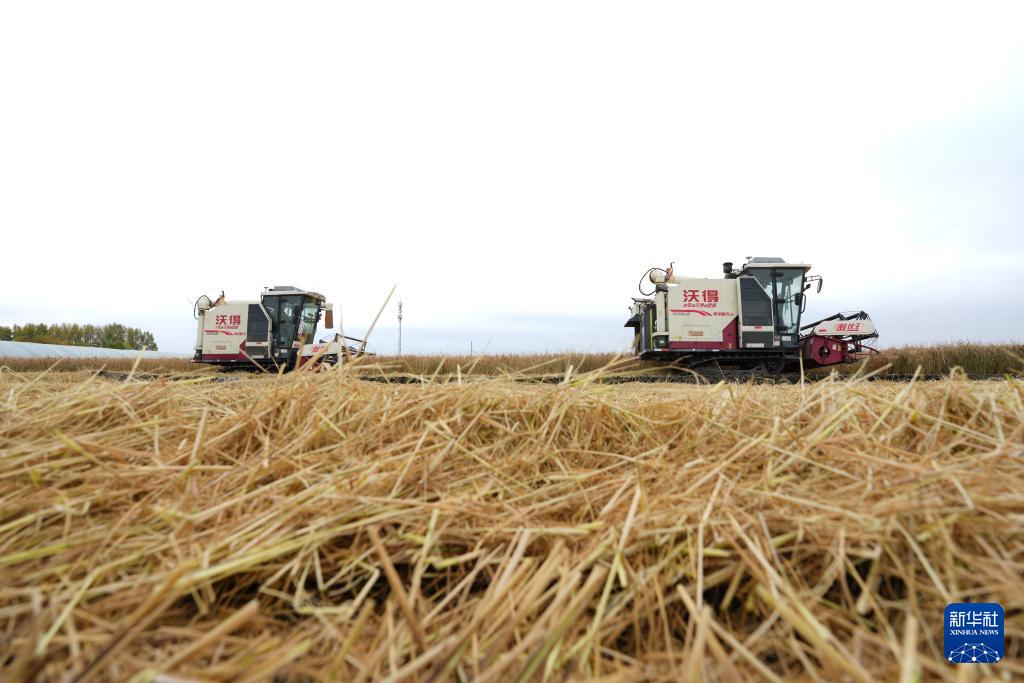 10月11日,在位于黑龍江省哈爾濱市的北大荒集團閆家崗農場有限公司,機械設備在進行水稻收獲作業。