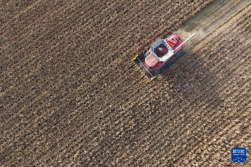 10月11日,在位于黑龍江省肇東市的北大荒集團四方山農場有限公司,機械設備在進行玉米收獲作業(無人機照片)。
